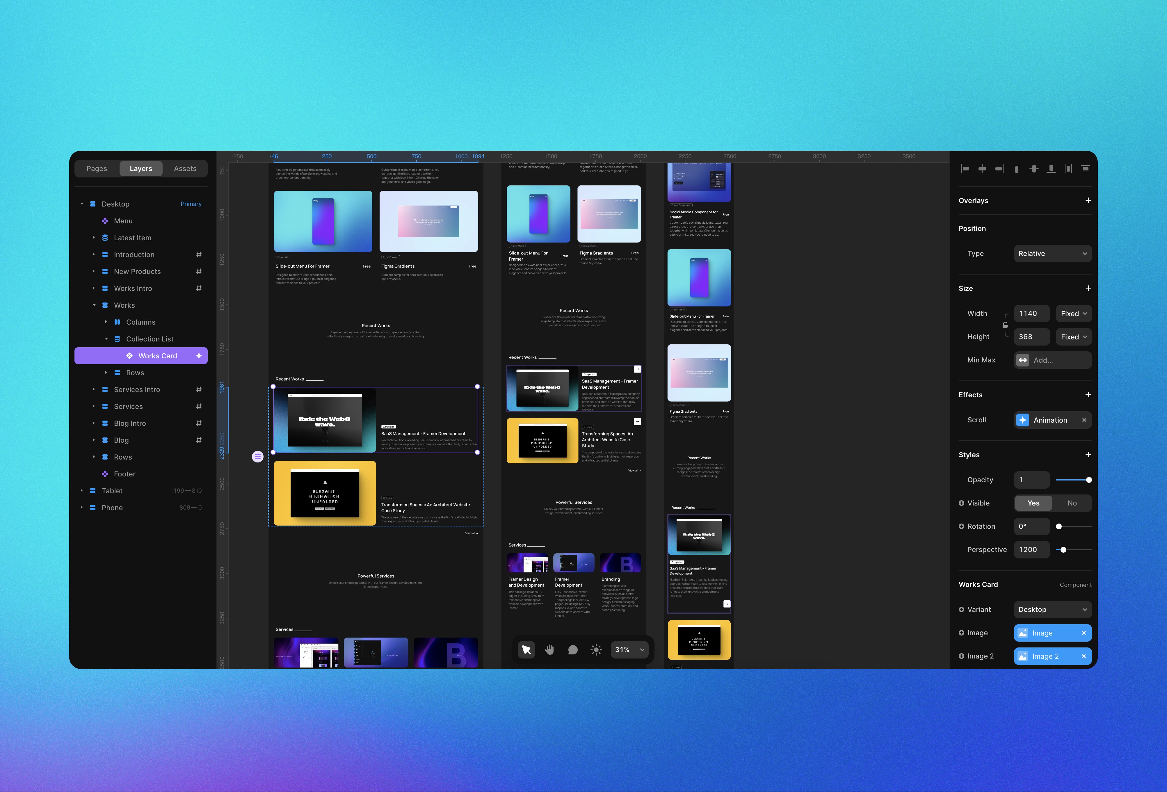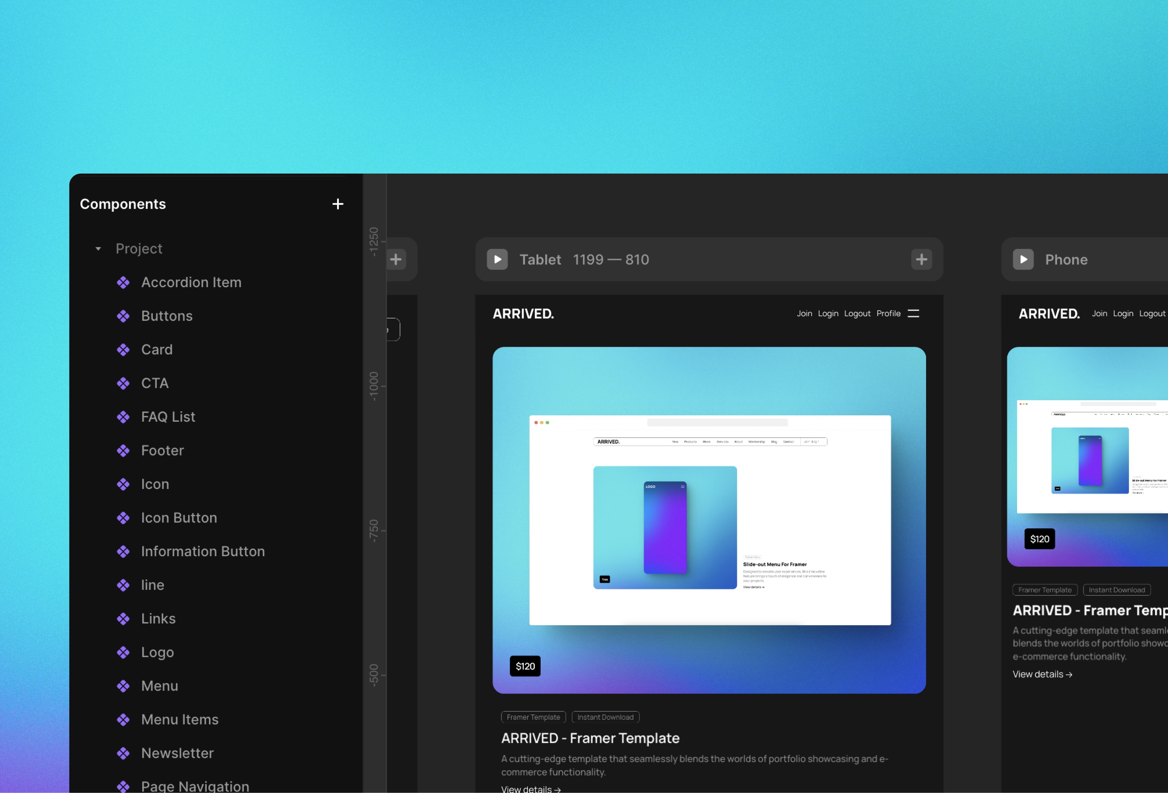 Pre-built custom components will save you time. Choose your layout, colors, and publish your website in seconds with the power of Framer.